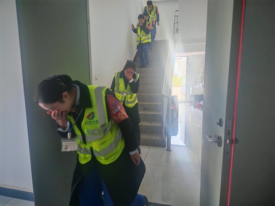 建(个)元项目团支部组织专题消防安全知识宣讲。站管人员结合近期典型火灾案例,讲解收费站工作区、生活区用火用电的常见风险、火灾预防的基本措施、初期火灾的扑救方法以及火场逃生自救技巧。理论宣讲结束后,现场组织了实战演练。演练模拟办公楼内因电器短路引发火情的场景。随着警报响起,应急疏散预案立即启动,全体员工在疏导员的指引下,弯腰低姿、用湿毛巾捂住口鼻,沿着预定疏散路线迅速、有序地撤离至安全地带。