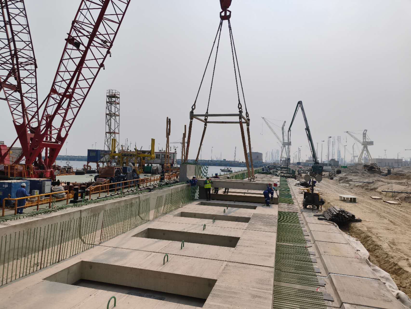 11月12日,随着最后一块胸墙预制件稳稳就位,沙特国王港项目P4包三号码头墙延伸段胸墙预制块全部安装完成,标志着该码头墙正式进入盖梁浇筑阶段。