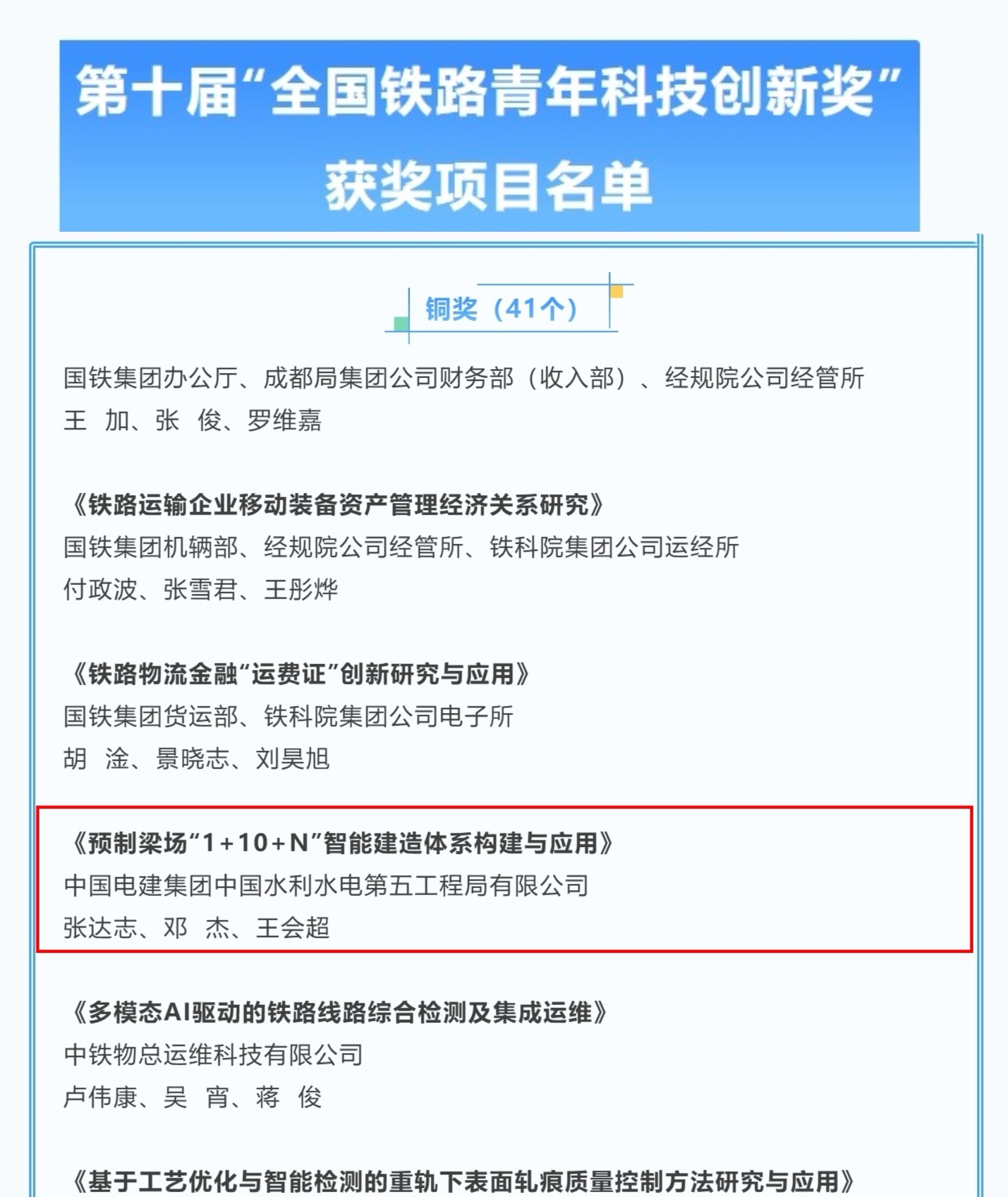 日前,第十届全国铁路青年科技创新奖评选结果正式揭晓,由公司雄商项目研发课题《预制梁场“1+10+N”智能建造体系构建与应用》代表电建集团首次入围并荣获铜奖。