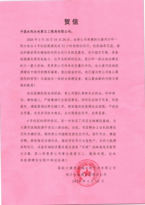 国能大渡河流域水电开发有限公司贺信